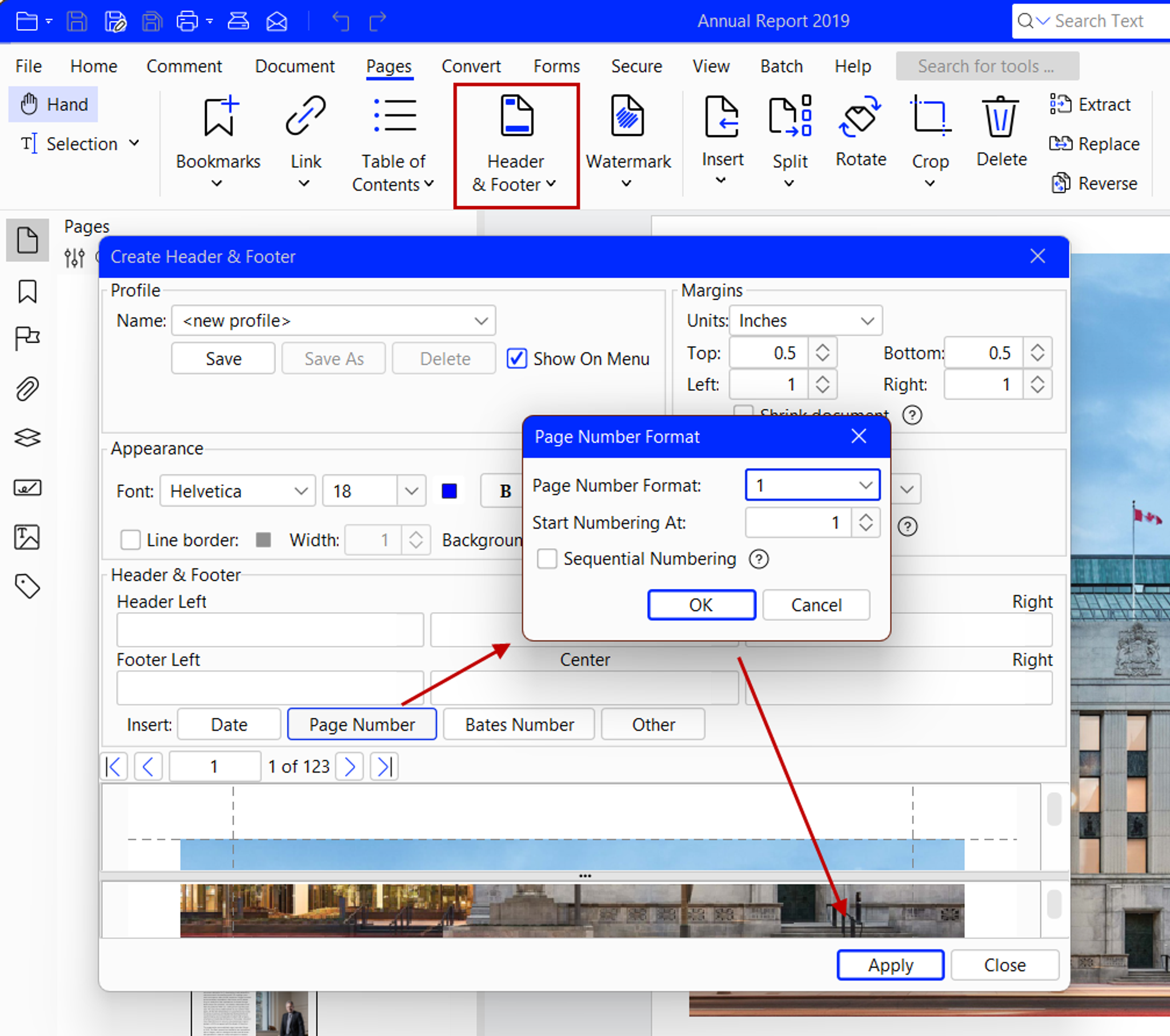 Then go to Pages > Add > Header & Footer. Click on Page Number to set up your numbering and click on OK. Set your formatting options. Click on Apply and save your PDF.